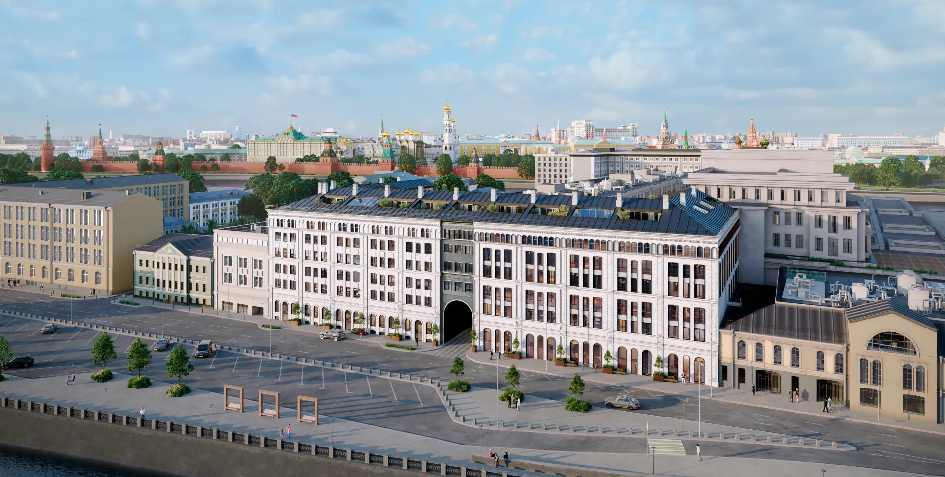 Сквозная арка DUO соединяет реставрированное Кокоревское подворье и современное крыло, образуя камерный внутренний атриум: здесь старый камень встречает сверкание стекла XXI века, а панорама реки разворачивается уже в первом шаге за порог дома.